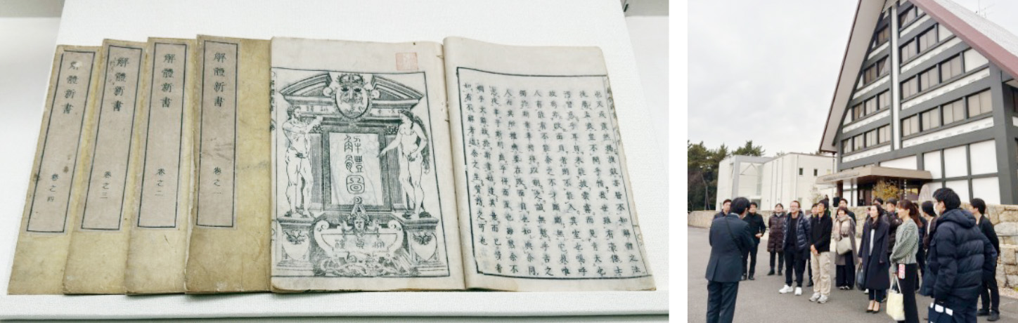 内藤記念くすり博物館は「くすりに関する国内外の資料を広く収集し、過去から現代に至る知見を伝える」ことを目的に1971年に創設され、収蔵資料65,000点と収蔵図書62,000点を通して薬学・薬業の歴史やくすりの正しい使い方を社会に伝えています。同館はその公的な役割が高く評価され、2024年には登録博物館としての認定を受けています。展示物には、明治期に杉田玄白・前野良沢らが中心となり翻訳した『解体新書』の木版本があり、医療知識や用語がどのように形成され、広まっていったかという文脈が浮かび上がっていました。また、江戸期の製剤道具や薬箱、昔の調剤器具などを目にし、技術の進歩だけでなく「知の継承」がいかに大切かを実感しました。